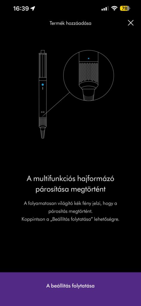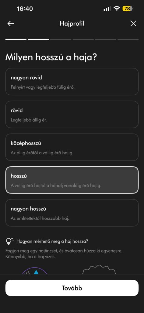Ezután az app lépésről lépésre végigvezetett néhány alap kérdésen a hajammal kapcsolatban: milyen hosszú, mennyire vastag, inkább egyenes, hullámos vagy göndör, milyen gyakran formázom, milyen eredményt keresek. Ezekre a válaszokra építve kaptam egy rövid, személyre szabott tutorialt a Co‑anda2x használatáról, konkrétan megmutatva, melyik fejhez milyen hőmérséklet és légáram‑beállítás illik, milyen nedvességi állapotról érdemes indulni, és hogyan haladjak végig a hajamon.